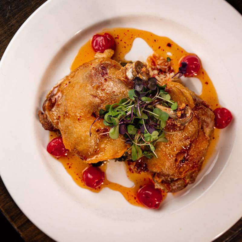 Andouille sausage 'dirty' rice, stewed collard greens, pickled cherries, Aleppo pepper honey.