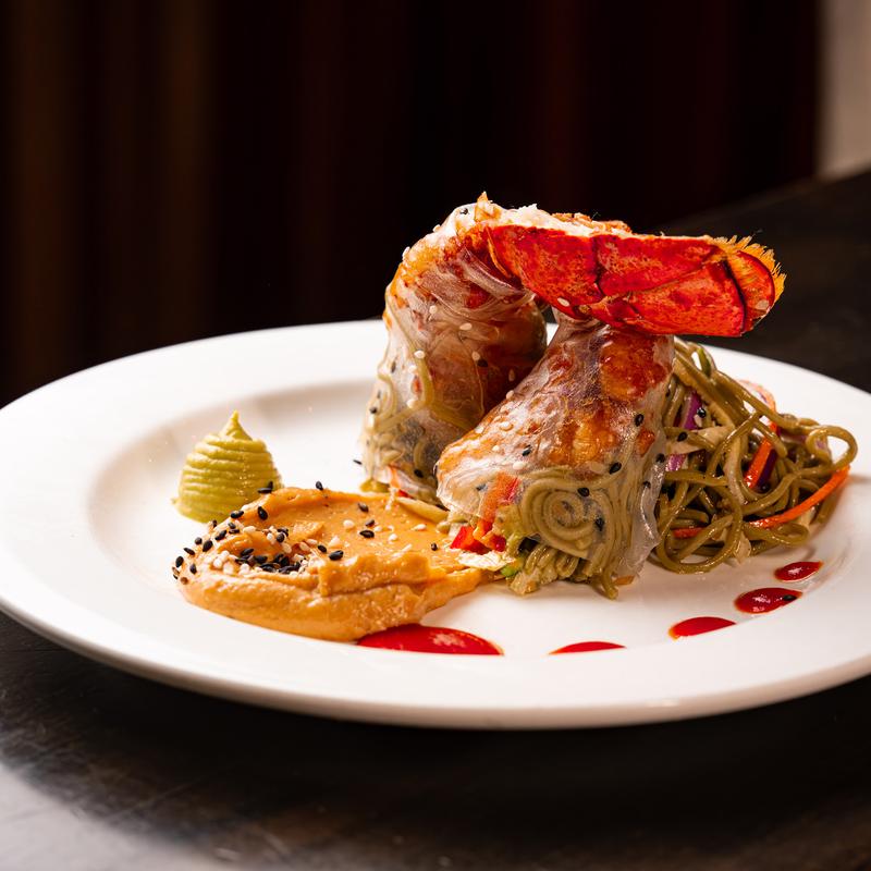 Tempura-fried Maine lobster tail, green tea soba noodle slaw, spicy Thai peanut sauce, and wasabi aioli.