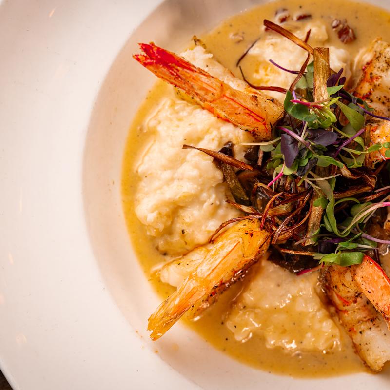 Wild Alabama jumbo shrimp with Anson Mills stone ground grits, French beans, and tomato-tarragon butter sauce.