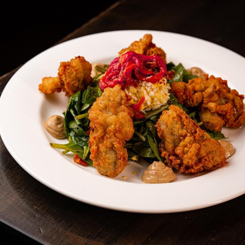 Crispy tempura fried oysters, baby spinach, chopped egg, crisp bacon, roasted red pepper, and creamy bacon balsamic aioli.
