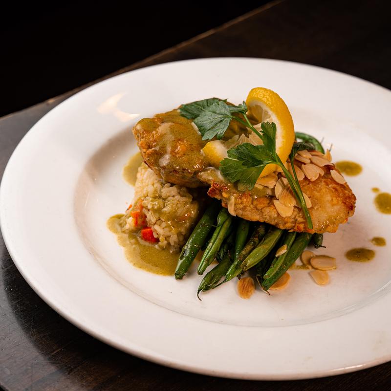 Carolina gold rice pilaf, blackened haricot verts, basil preserved lemon beurre blanc, toasted almonds.