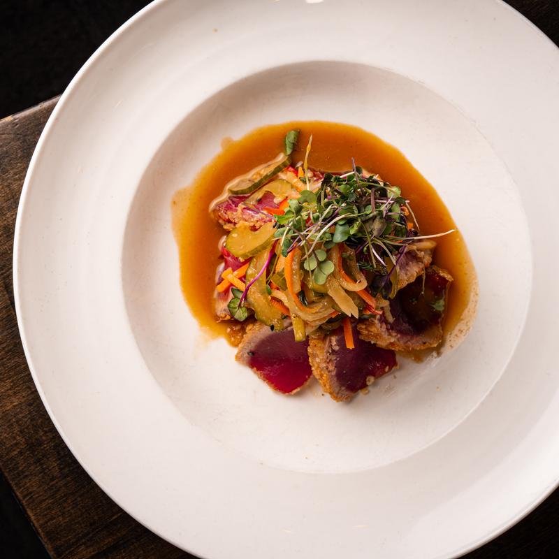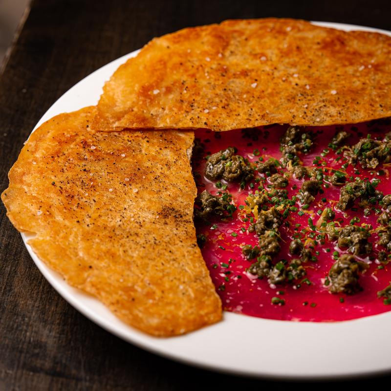 Fresh Gulf yellowfin tuna, extra virgin olive oil, capers, and chives. Lemon, sourdough flatbread.